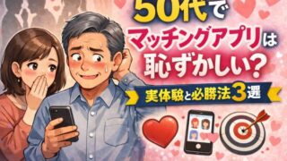 50代でマッチングアプリを使うのは「恥ずかしい」と感じている方へ。この記事では、熟年世代が抱きやすい心理や周囲の目、失敗例や実際の体験談、恥ずかしさを乗り越えて出会う方法まで詳しく解説します。安心して始めるコツも分かりやすく紹介しています。
